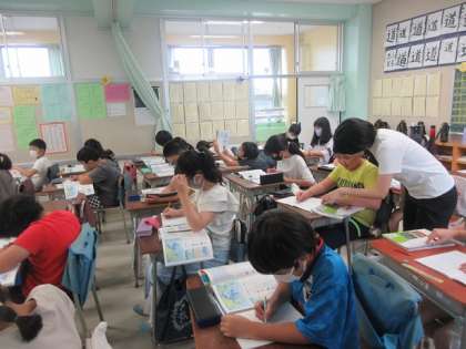 水産業をテーマに学習しています。日本の漁獲高の推移のグラフを見ながら、その特徴を調べています。