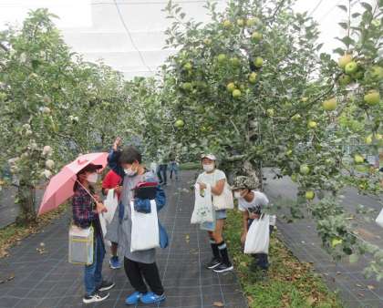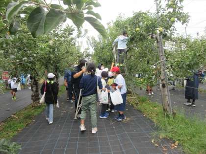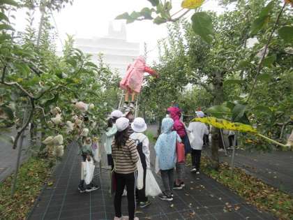 4年生が近隣の内海農園にでかけ、リンゴもぎをしました。