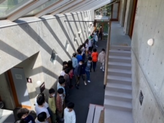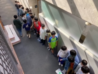 宿泊行事では必ず行うのが避難訓練です。初めての場所での安全な行動の基本です。