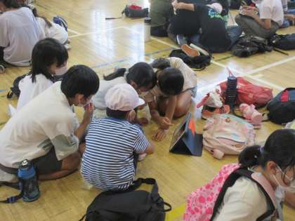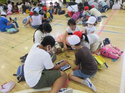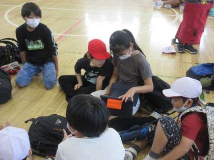 学校に戻ってきて体育館で、タブレットを見ながら、見つけてきたものを整理します。頭を寄せながら、話し合っている姿も良いですね。