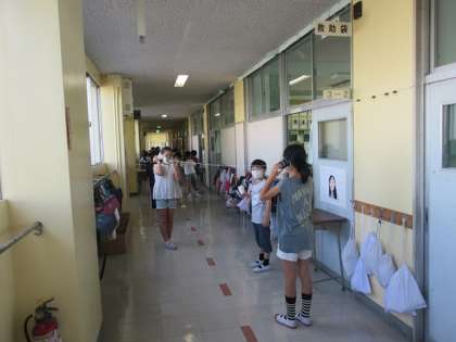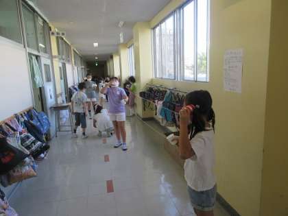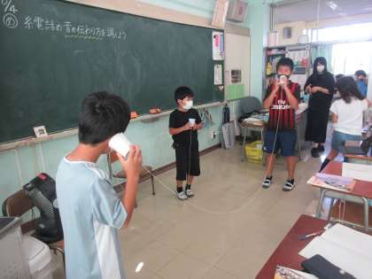 紙コップとたこ糸で、糸電話を作りました。音の伝わり方について実験しています。