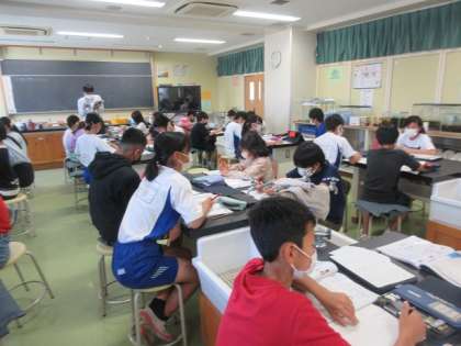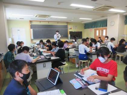 タブレットを活用し、てこの学習に関するまとめをしています。