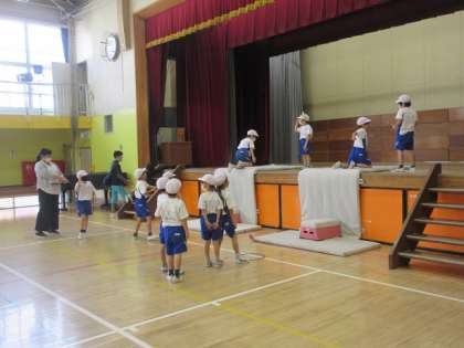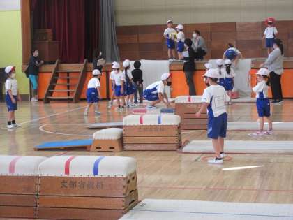 先生たちがたくさんに見に来たので、ちょっと緊張したようですが、元気いっぱいに跳び箱を使って、たくさん運動しました。