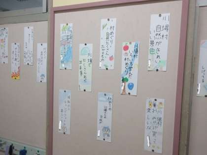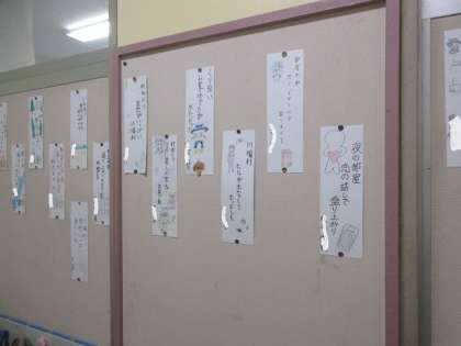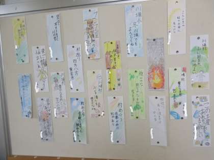 5年生の掲示板の短冊は、川場を題材に川柳を詠んでいます。1泊2日の楽しかった川が村の思い出がよみがえるようです。