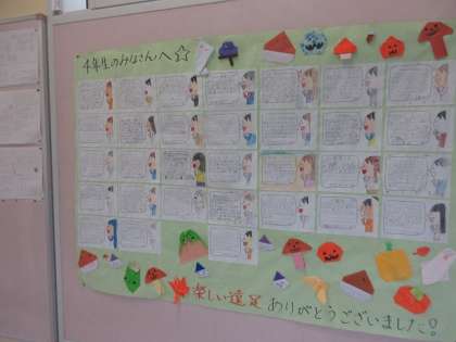 4年生の掲示板で見つけたのは、2年生からのたて割り班での感謝のメッセージでした。楽しかったことがたくさん書いてあり、4年生もがんばったかいがありましたね。