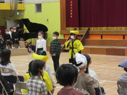 今年度の学芸会は、前半を1・2・3年生、後半を4・5・6年生に分けて実施しました。1年生から4年生までは、今回が初めての学芸会。今日は2年生の初めの言葉から始まりました。