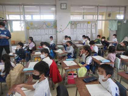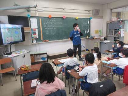教室の前のモニタには、いろいろなことをして子供たちが遊んでいるの絵が映し出されています。このの中から、比べることができるものを探しています。