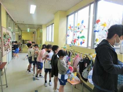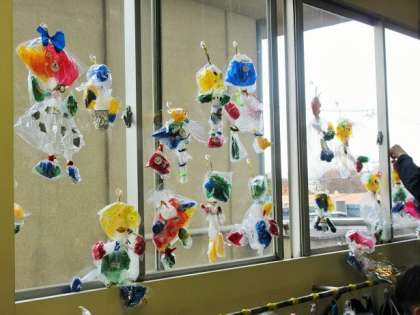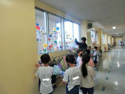 今日の作品は、カラーセロファンを使っているので、窓に飾ってみました。