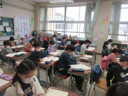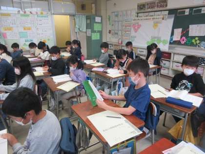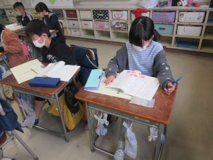 朗読を聞きながら、教科書を教材文を読み取っています。