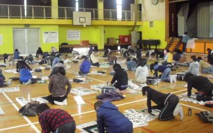 1月12日書き初め会を行いました。まるで冷蔵庫のような体育館の寒さにも負けず、心を静めて、ていねいに書きました。27日まで展示してありますので、子ども達の成果をぜひご覧下さい。