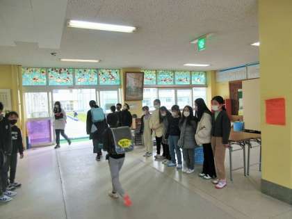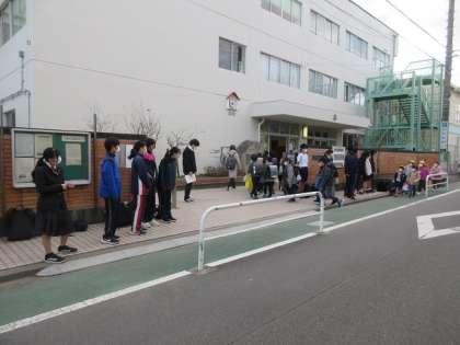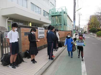 船橋希望中学校の生徒が正門前に、3年1組の子どもたちが昇降口たち、元気なあいさつで迎えています。
