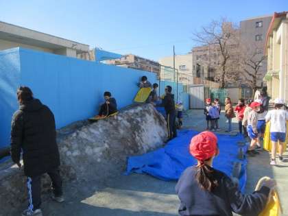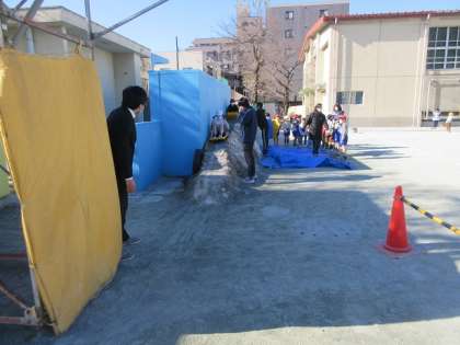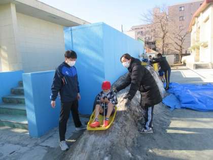 校庭のプール前に積まれた雪は、先週末に行われた区の新年のつどいで使われた雪です。小さなスロープですが、よく滑ります。