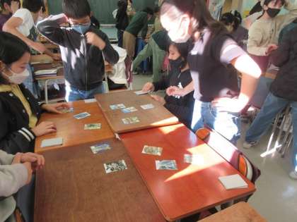 5年1組から賑やかな声が聞こえてきました。教室をのぞくと、グループ活動をしており、机の上にはカードが数枚あります。よく見てみると、『川場かるた』です。1月の交流では、川場小の5年生と一緒にやるので、事前学習ですね。