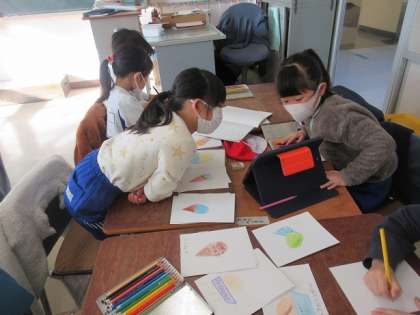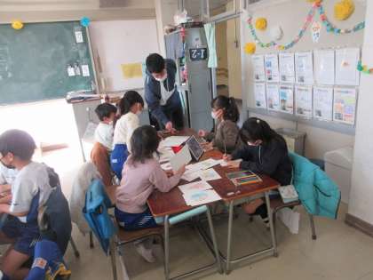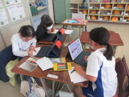 タブレットを使ってグループごとに調べたものを絵に描いています。