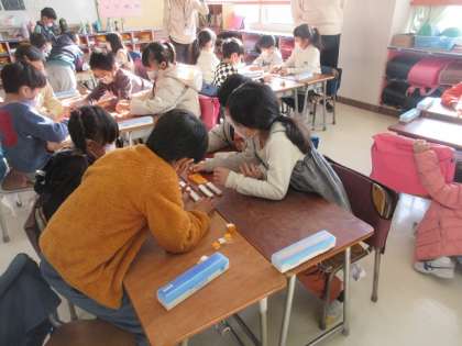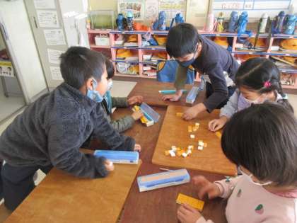 算数ブロックを使って、数のまとめ方を工夫しています。