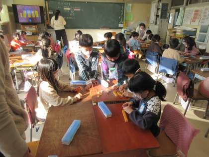 1年3組の算数の時間です。大きな数の数え方の工夫をグループで相談しています。
