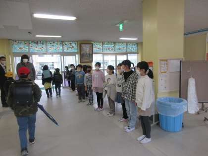 3学期のあいさつ運動も、3年4組が昇降口に立ち最終日となりました。