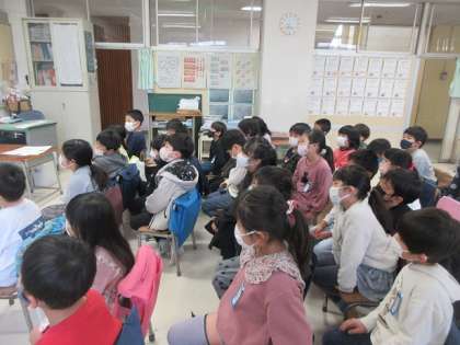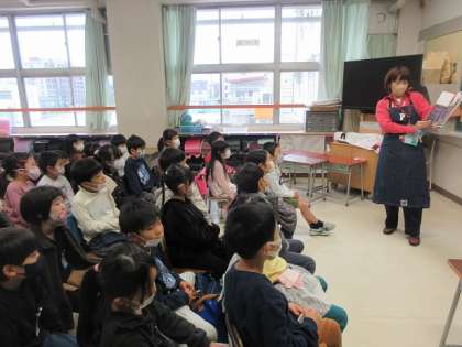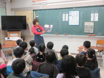 朝学習の時間に1年3組の教室では、保護者の図書ボランティアの方の読み聞かせが行われていました。子ども達は話に吸い込まれるように聞き入っています。