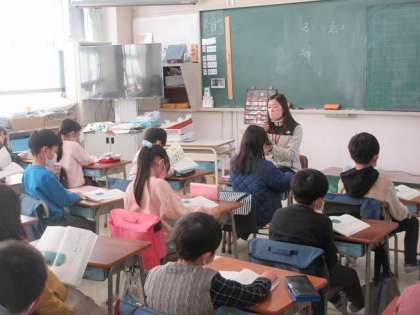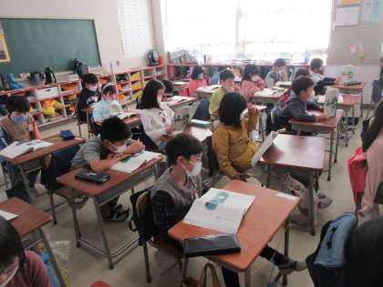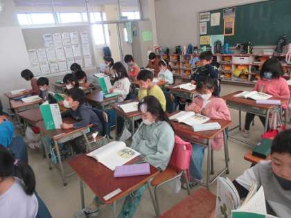 物語教材の「たぬきの糸車」を担任が音読しているの聴いています。