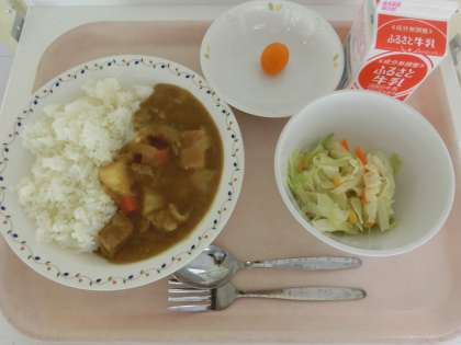 今学期最初のカレーライスです。給食の時間が近づくとともに廊下にカレーの香りがただよっていたためか、チャイムが鳴ると子どもたちは続々と給食をチェックしに来ていました。