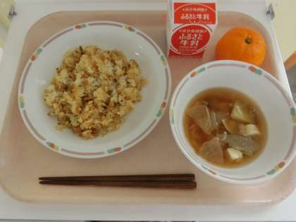スキー汁は、日本のスキー発祥の地である新潟県で生まれた汁物です。さつまいもや糸こんにゃくが入った豚汁といった風で、温かさと、さつまいもから出る素朴な甘みでほっこりします。子ども達も、由来を聞いて「なるほどね〜」と頷いていました。