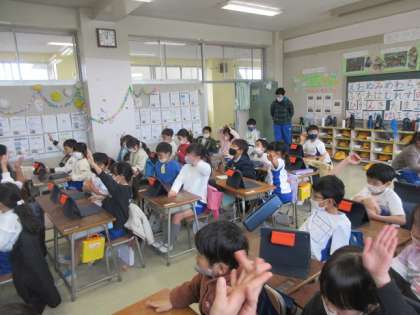 1年2組ではTeamsのログインの仕方を確認していました。