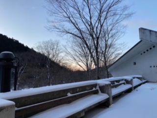 ビレッジの周辺もようやく明るくなって来ました。雪もやみ、今日の天候に期待が持てそうです。