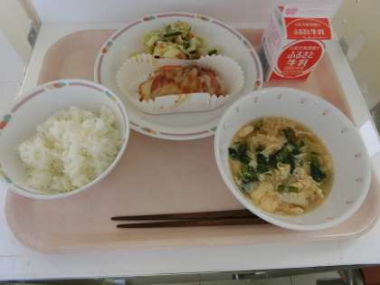かきたま汁は、とろみをつけたすまし汁に、溶き卵を流し入れて作ります。学校全員分となると卵もたくさん使います。慌てず騒がず、釜をゆっくりかき混ぜながら、溶き卵を細〜く流し入れると、卵がふわふわに仕上がります。子どもたちも「卵のスープが好き!」と嬉しそうでした。