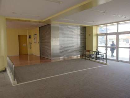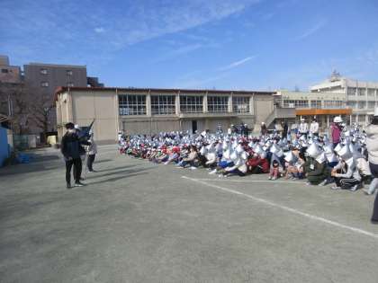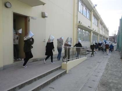 東昇降口付近の防火シャッターを下ろしての避難です。