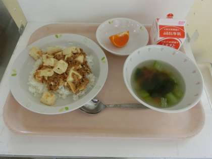 ピリ辛の麻婆豆腐をごはんにのせると、ごはんがもりもり進みます。辛さは、味を見ながらマイルドな味に調整しました。みんな「これ大好き!」「大盛りで食べたい」と喜んでいました。また、スープは細切りのきくらげ入りです。味にクセがなく、食感も海藻のようだからか、特に気にせず「きくらげも好き〜」と食べている子が多かったです。