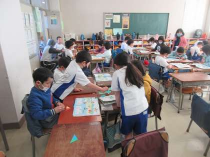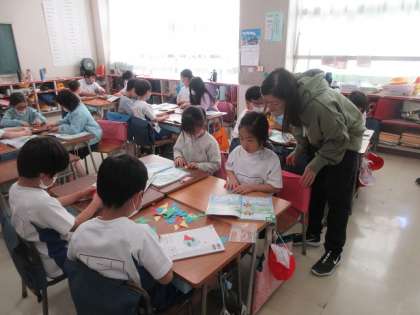 三角形の色紙を組み合わせて、いろいろな形を作ります。