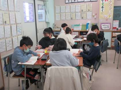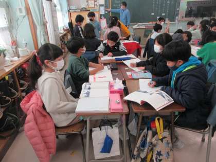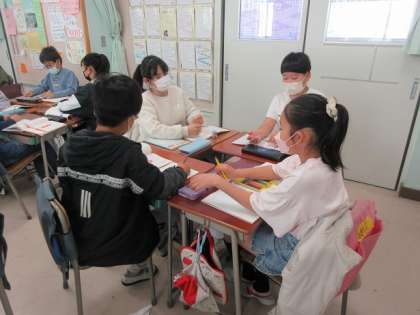 物語教材を読みながら感じた疑問をもとに、友だちと意見交換することで整理をしていきます。千歳台の子どもたちは、どの学年でもこのスタイルの学習を大事にしています。