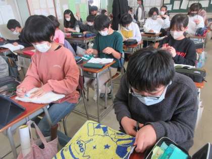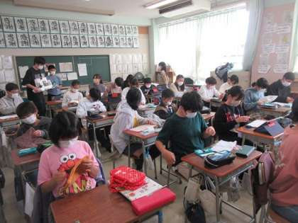 6年2組では、使わなくなったタオルなどを利用して、ひと針ひと針、心を込めて雑巾を縫っています。模様をつける工夫をしている6年生もいます。