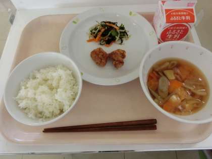 今日のおかずは6年生のリクエストから、鶏のから揚げ、野菜ののりあえです。身近な料理ですが、使う粉や下味のつけ方などは人それぞれ。千歳台小ではしっかり下味をつけてから、米粉と片栗粉をまぶして揚げています。時間がたっても中はジューシー、衣のザクザク感も残ったおいしいから揚げになりました。