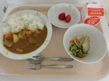 最後は給食の定番、カレーライスです!ぷるぷるのこんにゃくがおいしいサラダも、旬のいちごも大人気。どのクラスでもおかわりにたくさん手が上がり、食缶をどんどん空っぽにしていました。