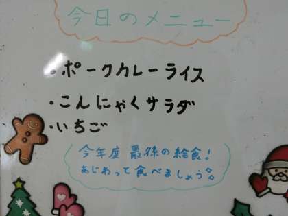 下の写真は、あるクラスで給食献立が書かれているホワイトボードです。(飾りがクリスマスなのは、ご愛敬です)こちらこそ、1年間ありがとうございました。「おいしい!」の笑顔、「いつも給食が楽しみ」という声…みなさんの“給食愛”から、いつもたくさんの元気をもらっています。