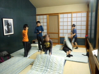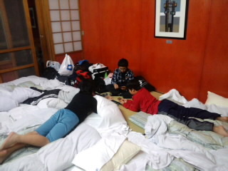 6年生はビレジに着き、荷物整理と食事を終え、部屋で思い思いの時間を過ごしています。