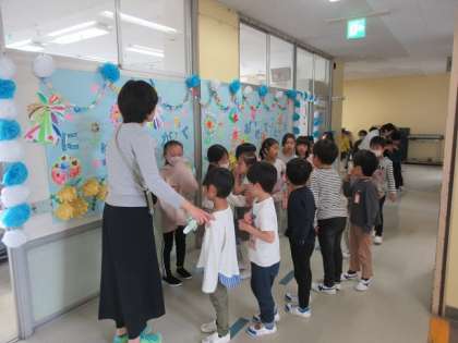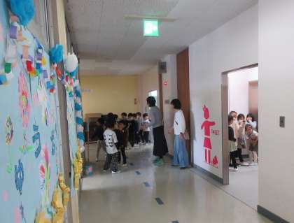 トイレの使い方を確かめている1年1組です。