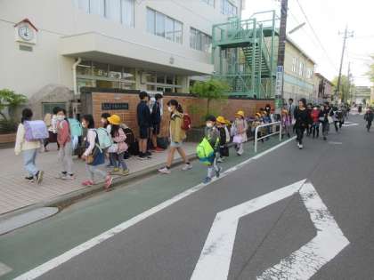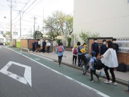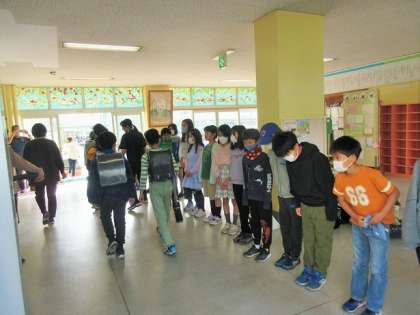 正門には、船橋希望中学校の生徒が、昇降口には5年2組の子ども達があいさつ登板として立っています。