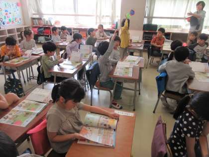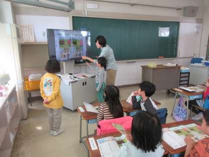 教科書の挿絵をテレビに映し、間違い探しをしています。