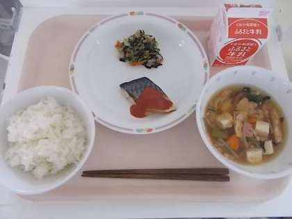 ごはん さばのトマトみそソースがけ 野菜ののり和え かまぼこ入りすましじる 牛乳