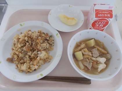 そぼろごはん さつま汁 りんご 牛乳