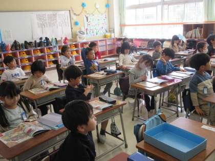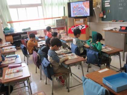 教室の前のテレビには、教科書と同じ画像が映されています。