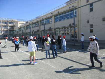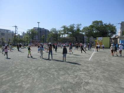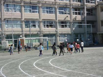 校庭では、ボールを使ったり、鬼遊びなど、広い校庭をいっぱいに使っています。