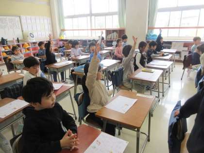 手をまっすぐにあげ、元気に答えています。