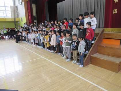 最後に1年生から、「ドキドキドン 1年生」の合唱の発表がありました。元気な歌声に全校から手拍子をもらいました。
