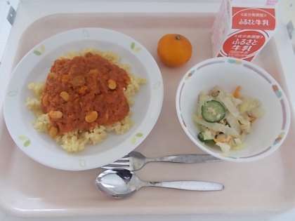 【こんだて】ポークビーンズライス ツナサラダ 冷凍みかん 牛乳