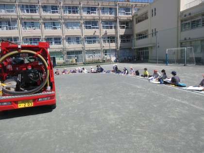 校庭に赤い消防車が2台やってきました。