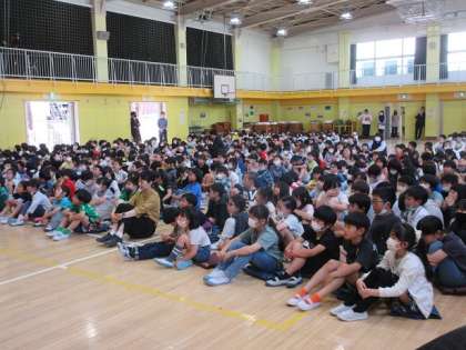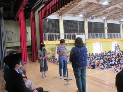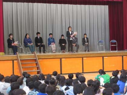 今日は、この4月に千歳台小を去られた先生方をお迎えして、離任式を行いました。