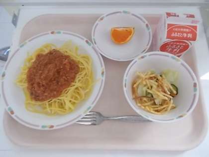 スパゲティミートソース じゃがいものバリバリサラダ カラマンダリン牛乳
